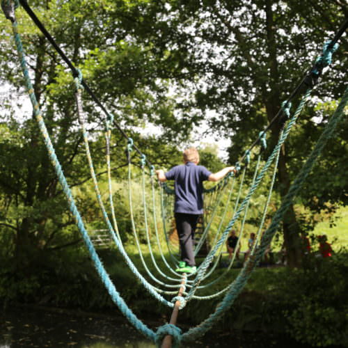 A 2 part challenge that involves crossing the river using a Burma bridge followed by returning back over the river on a mini zip wire. A great confidence builder to test their co-ordination and balance and build them up to the big zip wire later in their visit.